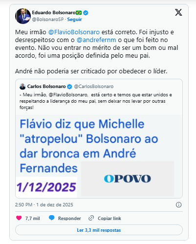 A declaração desencadeou manifestações dos outros filhos. Carlos Bolsonaro (PL-RJ) compartilhou uma notícia sobre o episódio e saiu em defesa do irmão: