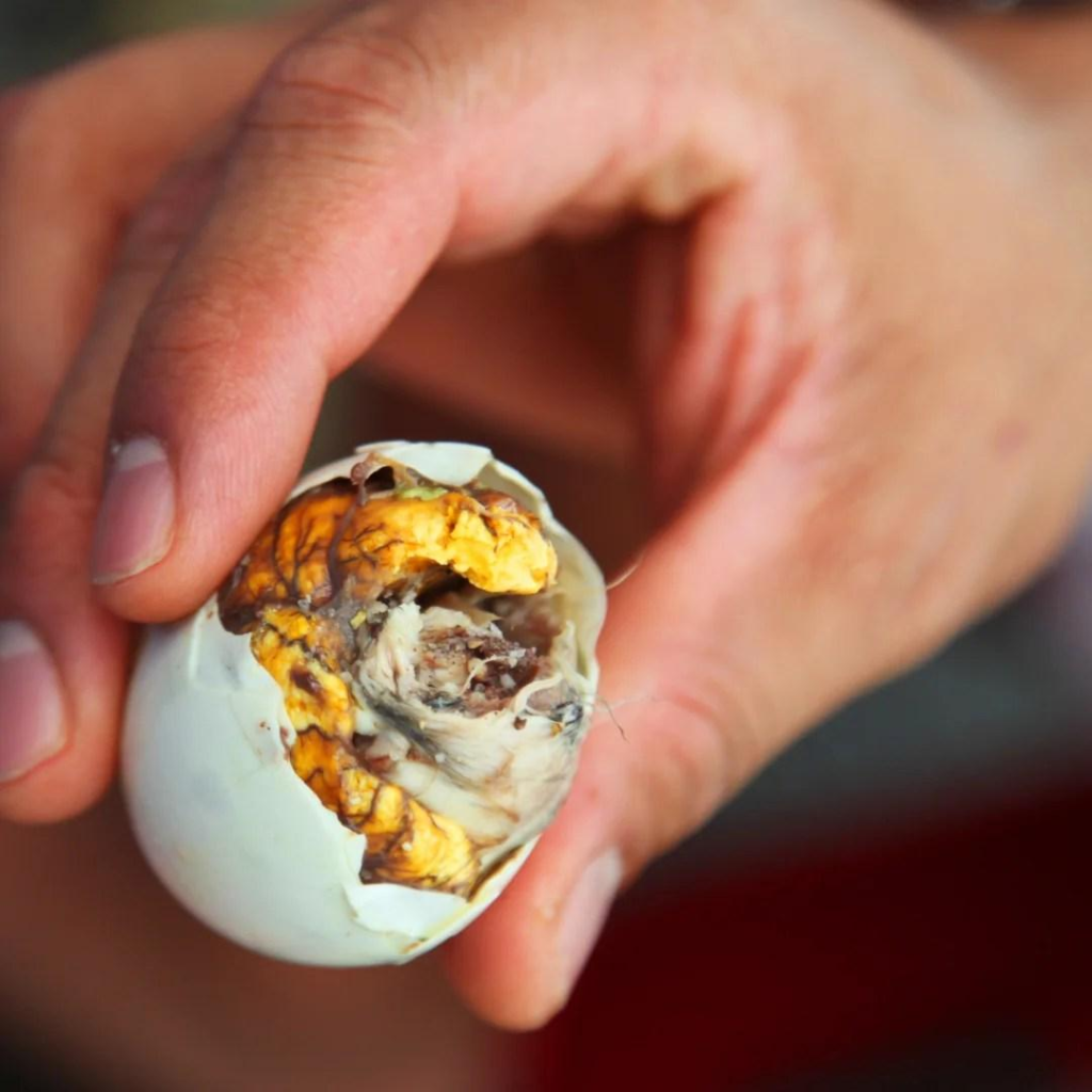 Outro prato que chama atenção é o balut, bastante consumido nas Filipinas. Trata-se de um ovo fertilizado com um embrião parcialmente desenvolvido, geralmente consumido cozido. Para quem não está acostumado, a aparência pode ser chocante, mas é visto como nutritivo e saboroso em sua cultura de origem.
