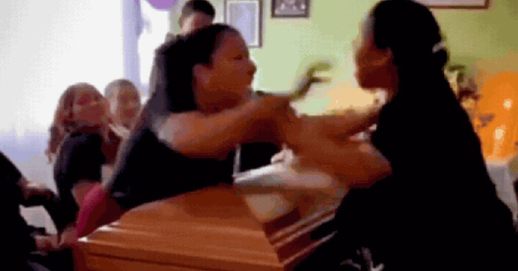 Durante o tumulto, a movimentação acabou deslocando parcialmente a tampa do caixão, o que tornou a situação ainda mais impactante. Em meio à confusão, uma das mulheres chegou a utilizar um arranjo de flores durante a briga, enquanto outras pessoas tentavam intervir para conter o conflito e evitar que a situação fugisse ainda mais do controle.